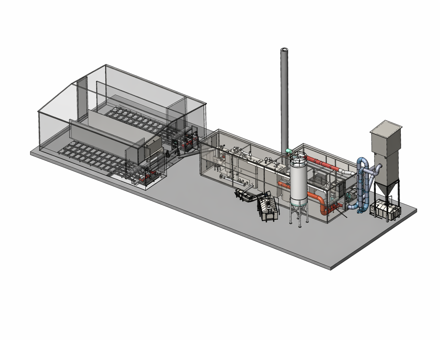 Waste incineration boiler house with a capacity of 2 MW 8 bar, 140 degrees – a modular solution. Includes three warehouses for different types of fuel and garbage. Gas cleaning system with the addition of chemicals and subsequent cleaning in a bag filter, continuous monitoring of emissions into the atmosphere. ORC generator with a capacity of 110 kW.